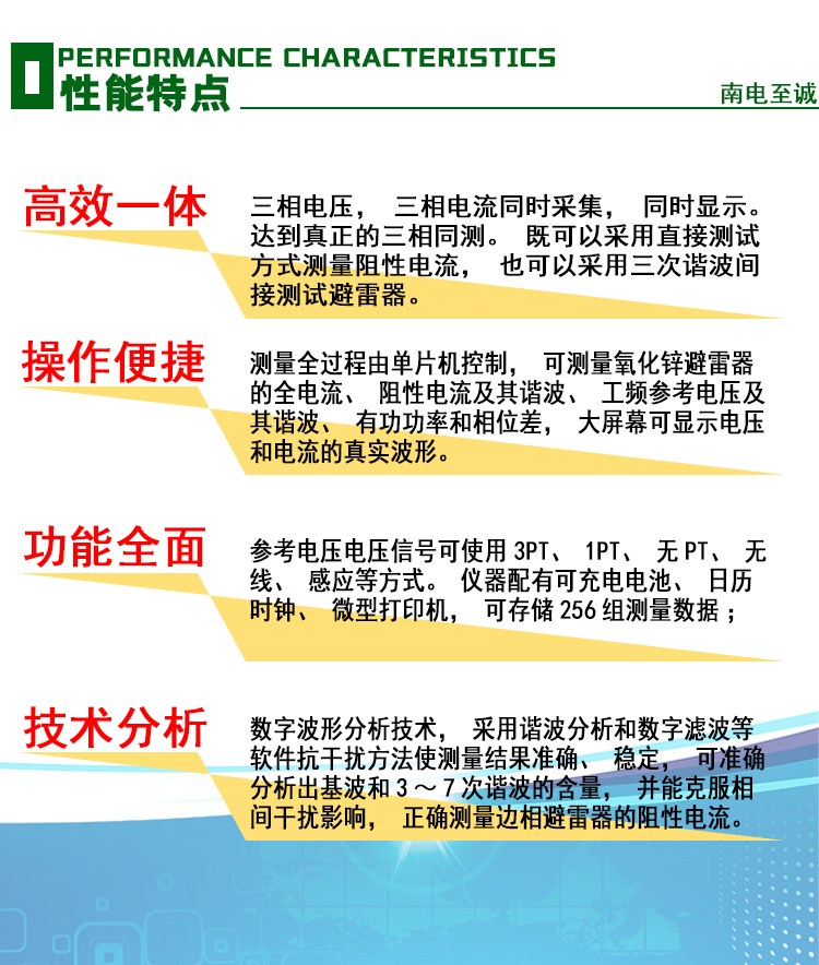 儀器操作簡單、使用方便,測量全過程由單片機控制,可測量氧化鋅避雷器的全電流、阻性電流及其諧波、工頻參考電壓及其諧波、有功功率和相位差,大屏幕可顯示電壓和電流的真實波形。儀器運用數(shù)字波形分析技術,采用諧波分析和數(shù)字濾波等軟件抗干擾方法使測量結果準確、穩(wěn)定,可準確分析出基波和3~7次諧波的含量,并能克服相間干擾影響,正確測量邊相避雷器的阻性電流。本機配有高速面板式打印機,可充電電池,試驗人員在現(xiàn)場使用十分方便。儀器采用獨特的高速磁隔離數(shù)字傳感器直接采集輸入的電壓、電流信號,保證了數(shù)據(jù)的可靠性和安全性。