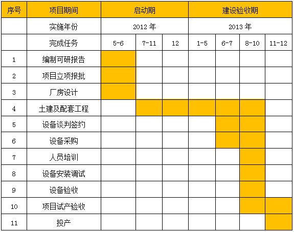 項目總投資主要來自項目發(fā)起公司自籌資金,按照計劃在2012年3月份前完成項目申報審批工作。預計項目總投資資金到位時間在2011年4月底。整個項目建設期內(nèi),主要完成項目可研報告編制、項目備案、土建及配套工程、人員招聘及培訓、設備簽約、設備生產(chǎn)、設備運行及驗收等工作。