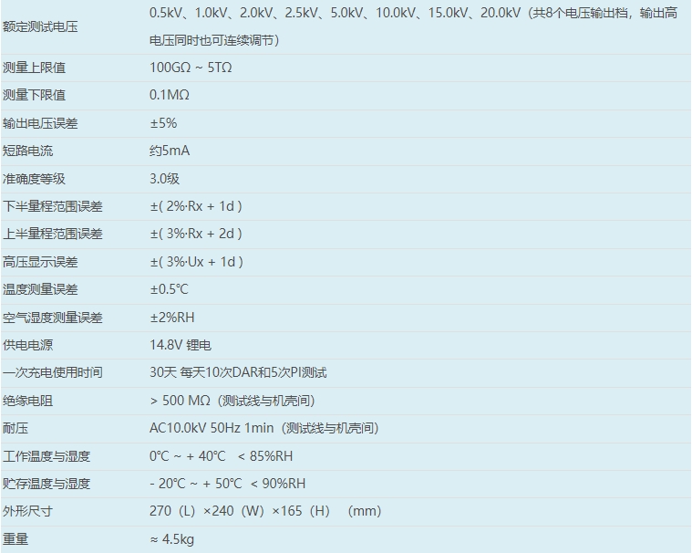 >有0.5kV、1.0kV、2.0kV、2.5kV、5.0kV、10.0kV、15.0kV、20.0kV共8個電壓輸出檔。