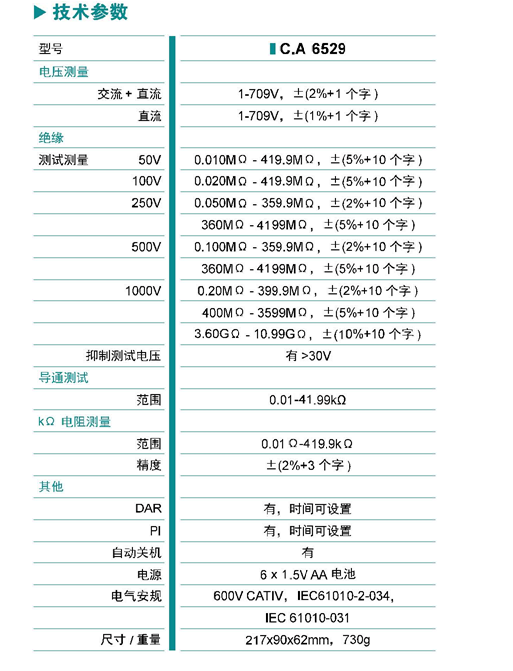 CA 6529測量范圍:絕緣電壓有50/100/250/500/1,000V,AC 或DC 電壓測量高達(dá)700V。絕緣電阻高達(dá)10GΩ,PI和DAR測試。PI和DAR測試,多種固定方式支持中文面板.CA 6529廣泛用于電氣設(shè)備驗收測試及預(yù)防性維護(hù),電動機(jī)、導(dǎo)線、開關(guān)設(shè)備以及電氣電纜絕緣測量民用及工業(yè)用電檢測。法國CA6529 1kV 絕緣電阻測試儀采用了五檔電壓量程,可以滿足多種絕緣測試需求。